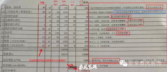 一般施工隊在每項報價后面會注明是用什么材料及施工工藝,比如墻面漆30元/平方米,應(yīng)注明對于墻面基層的處理工藝,如刮幾遍膩子找平,乳膠漆的品牌型號及涂刷工藝,如刷前加一遍底漆及乳膠漆加水的百分比和滾涂遍數(shù)等。還有一些額外的預(yù)算,報價的時候一定要提前告知業(yè)主,比如墻面底基找平處理,地面找平等,還有瓷磚規(guī)格過大或過小,都要加錢的,這些收費項目施工方都應(yīng)提前告知業(yè)主或者有備注說明,如果在預(yù)算中不寫上,到現(xiàn)場施工時才提出來,面對突然多出來的費用,一般業(yè)主會難以接受。